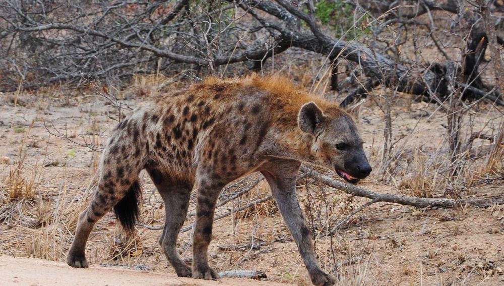 La hiena espera un rato debajo del árbol antes de escapar al darse cuenta de que no tenía opciones de capturar a su presa.