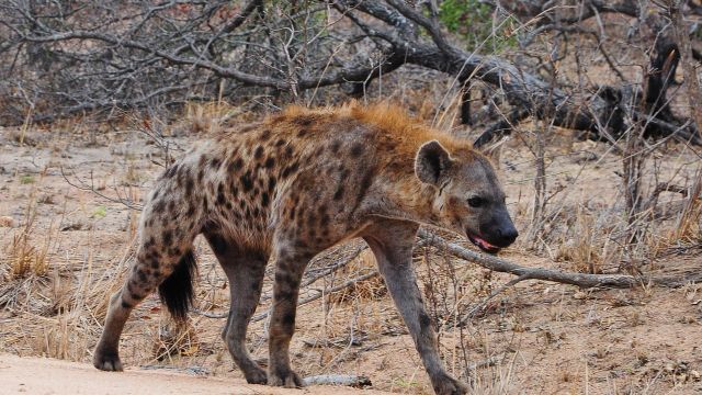 La hiena solitaria luego comienza a caminar rápidamente hacia el arbusto donde se esconde el cachorro de leopardo. Cuando el jocen animal se da vuenta salta del arbusto y se pone a correr mientras lo persiguen de cerca.