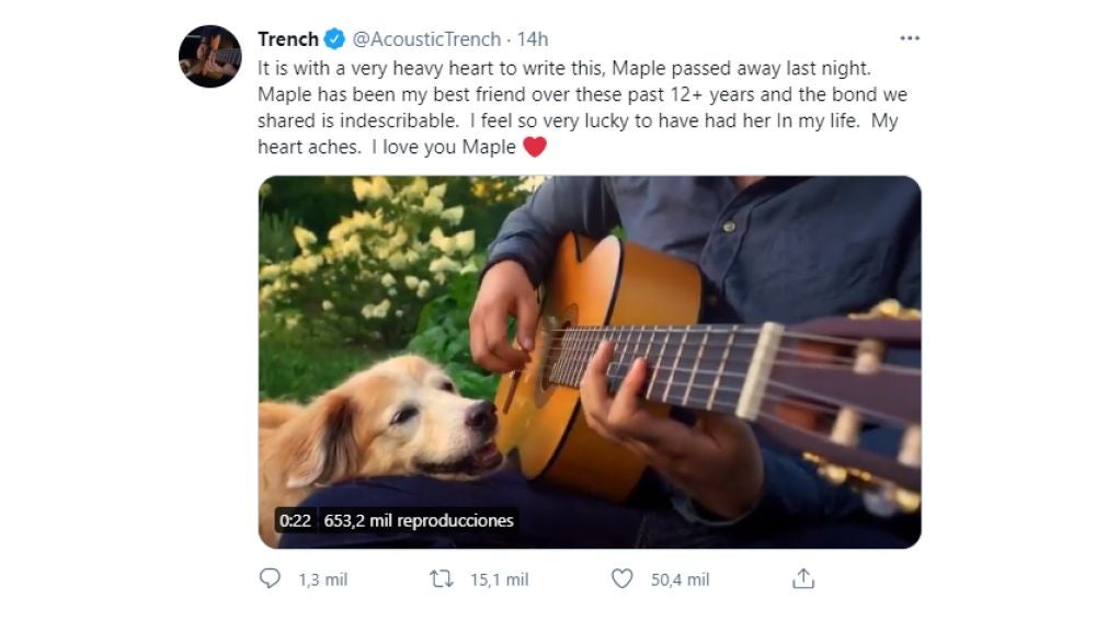 El YouTuber AcousticTrench, que acumula 2,1 millones de suscriptores, acudió a su cuenta de Twitter para compartir la noticia de la muerte de su perro, Maple. Tras la noticia de la muerte de Maple, los internautas dejaron comentarios tristes y con el corazón roto.