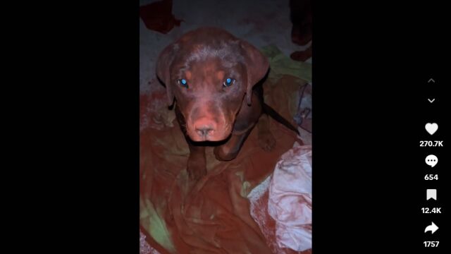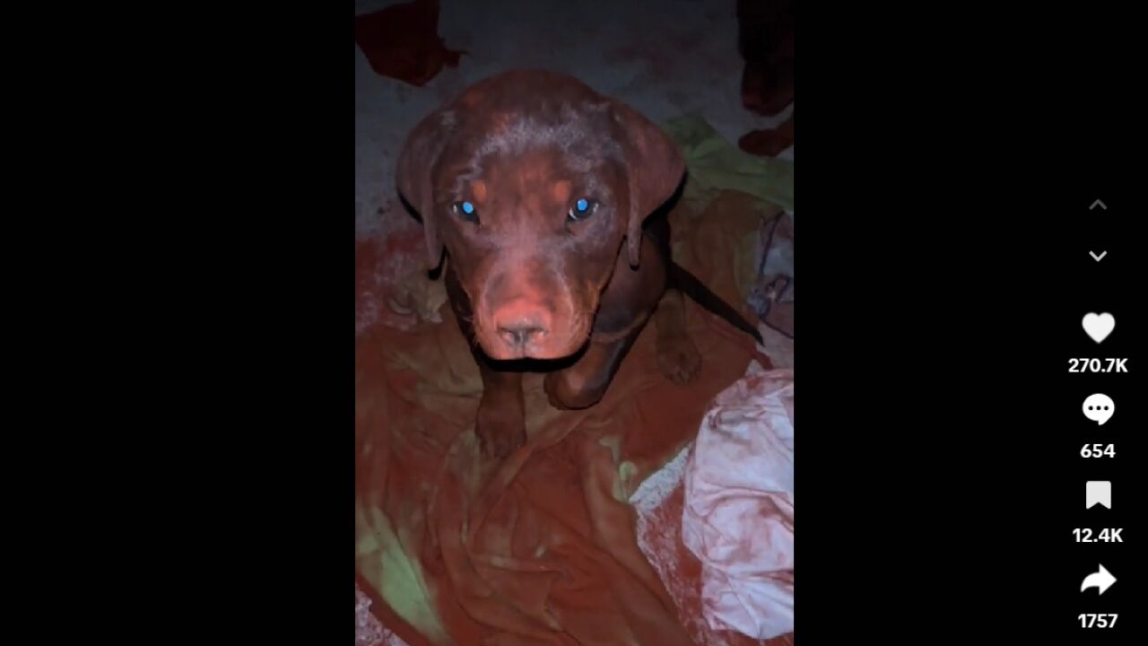 La chica camina por el patio de su casa mientras muestra a cámara su mano manchada de rojo. Entonces alza el móvil para grabar a los culpables. Primero aparece un cachorrito de rottweiler con el pelaje casi completamente manchado de un color rojizo y, a los pocos segundos, se deja ver un segundo perrito igual de sucio.