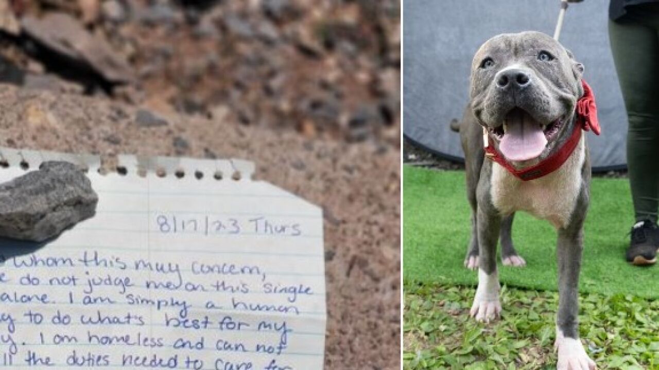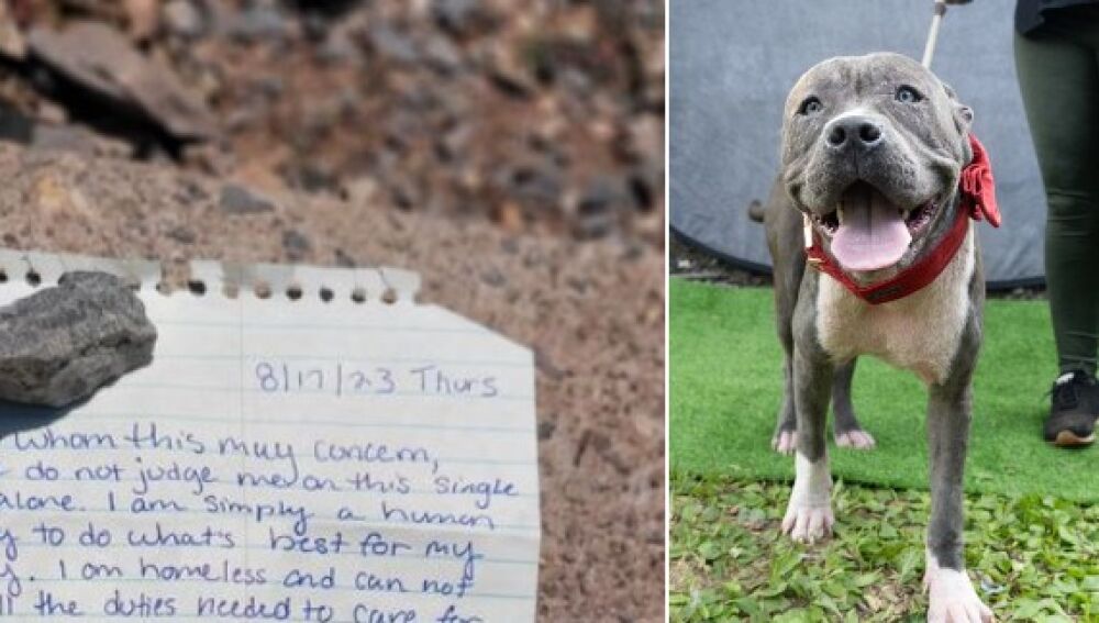 "A quien pueda interesar: Por favor, no me juzgues solo por este acto. Soy simplemente un ser humano intentando hacer lo que es mejor para mi mascota. Vivo en la calle y no puedo cubrir sus necesidades. He intentado buscarle un hogar o una familia. No puedo mantenerle a él ni a mi. Es la única forma que sé que podréis cuidarlo y que esté salvo. Él es muy dulce y tiene buen carácter y está bien educado.