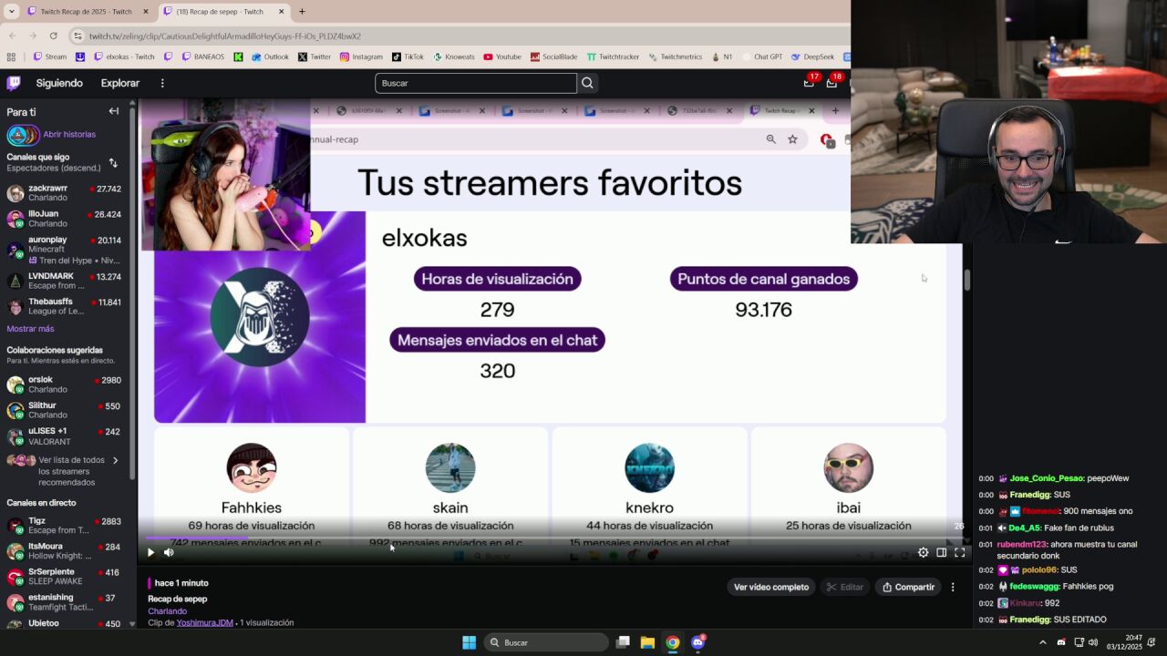 El detalle que encendió la escena fue la aparición de Skain entre los canales más vistos por Zeling. Al ver ese dato, Xokas reaccionó en tono exageradamente celoso y lanzó una serie de comentarios irónicos sobre la cantidad de mensajes que, según el recap, su pareja había enviado al chat de Skain en comparación con el suyo. En su intervención llegó a bromear sobre si ella solo veía a streamers hombres.