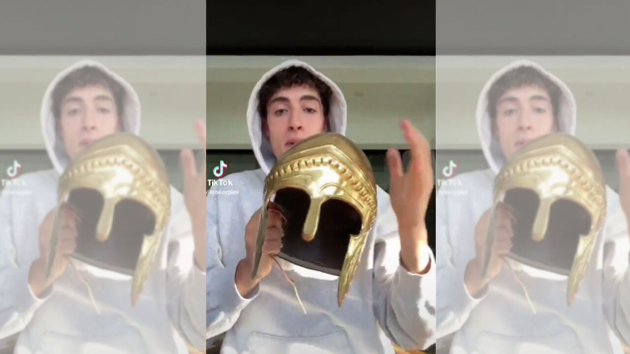 "Visto que todavía no me dices con qué casco vamos a pelear, vengo a presentarte nuevas opciones", comienza Plex, antes de desplegar una serie de propuestas cada vez más llamativas. La primera remite a un casco de inspiración griega, "bastante duro" y con protección en los pómulos. Después, introduce uno de gladiador romano con elementos como pinchos que, según bromea, podrían dificultar el golpeo.