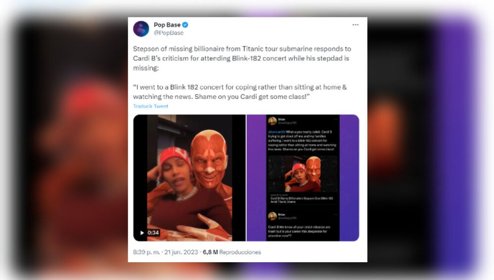 La búsqueda del submarino desaparecido del Titanic ha dado lugar a toda una serie de discusiones paralelas que poco tienen que ver con los esfuerzos que se están haciendo por encontrar con vida a sus pasajeros. Entre ellas, la del hijastro de uno de los multimillonarios a bordo del submarino es la que más conversación ha dado: decidió acudir a un concierto de su grupo favorito, Blink 182, mientras su padrastro estaba desaparecido en el mar. Aunque muchos criticaron su forma de actuar, las duras palabras de la cantante Cardi B al respecto han sido las que más han llamado la atención.