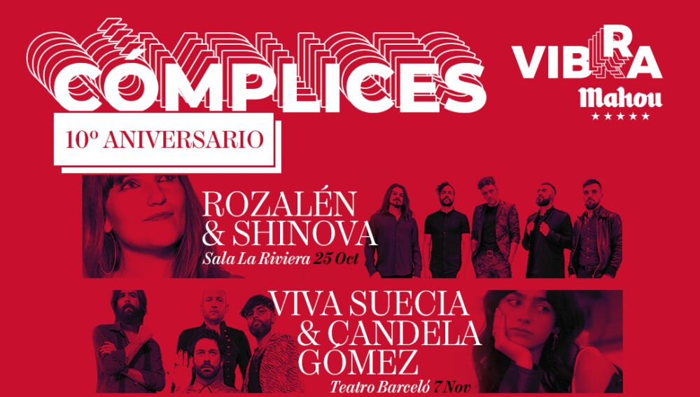 Cómplices Vibra Mahou celebra su décimo aniversario con un cartel de altura. El histórico formato creado por la plataforma de música de Mahou Cinco Estrellas que promueve los encuentros en torno a la música en directo, vuelve con colaboraciones únicas a dúo en esta ocasión entre Shinova y Rozalén; Viva Suecia y Candela Gómez; Carolina Durante y Amaral; y Albany y Juicy Bae. Los conciertos se celebrarán en cuatro salas madrileñas los próximos 25 de octubre y 7, 14 y 23 de noviembre.
