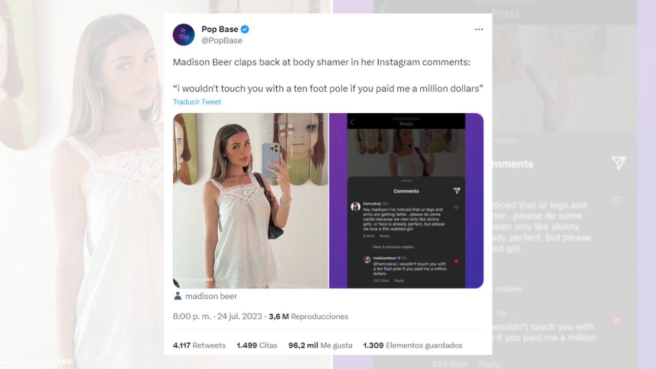 "No te tocaría ni con un palo de diez metros, aunque me pagaran un millón de dólares". Esta ha sido la respuesta tan contundente que la cantante ha dado a este usuario, a quien las redes no han tardado en criticar por el comentario tan desagradable que le ha dejado a Madison Beer. Cada vez es más común encontrarse este tipo de comentarios en las redes, donde algunos hombres se creen con el derecho de exigir cambios en los cuerpos de las mujeres o incluso criticar sus decisiones, algo que la cantante no está dispuesta a tolerar.