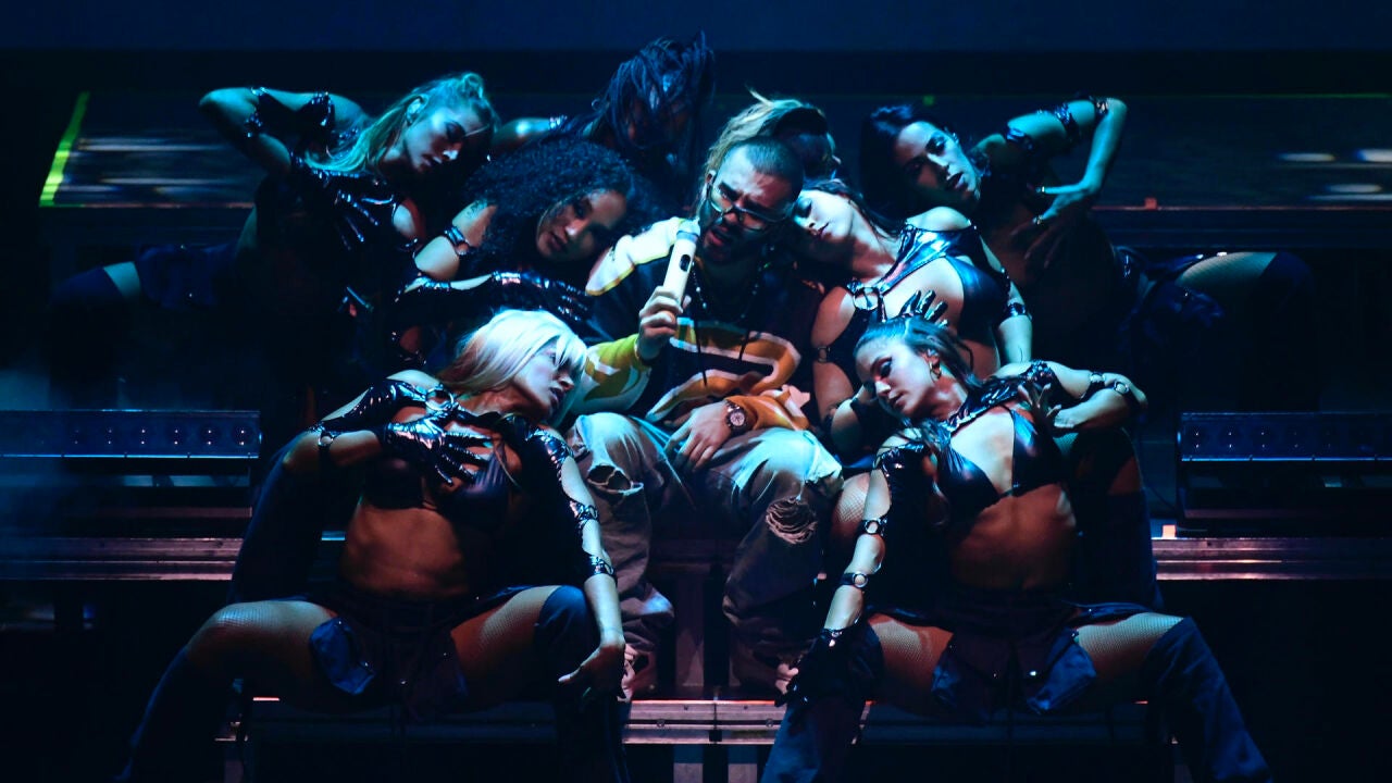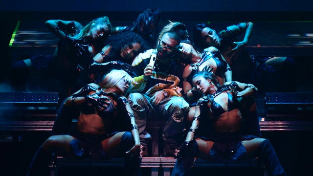 Acompañado de ocho bailarinas, el cantante siguió con Mala costumbre y Amor en coma, vestido con un suéter naranja y pantalones vaqueros.