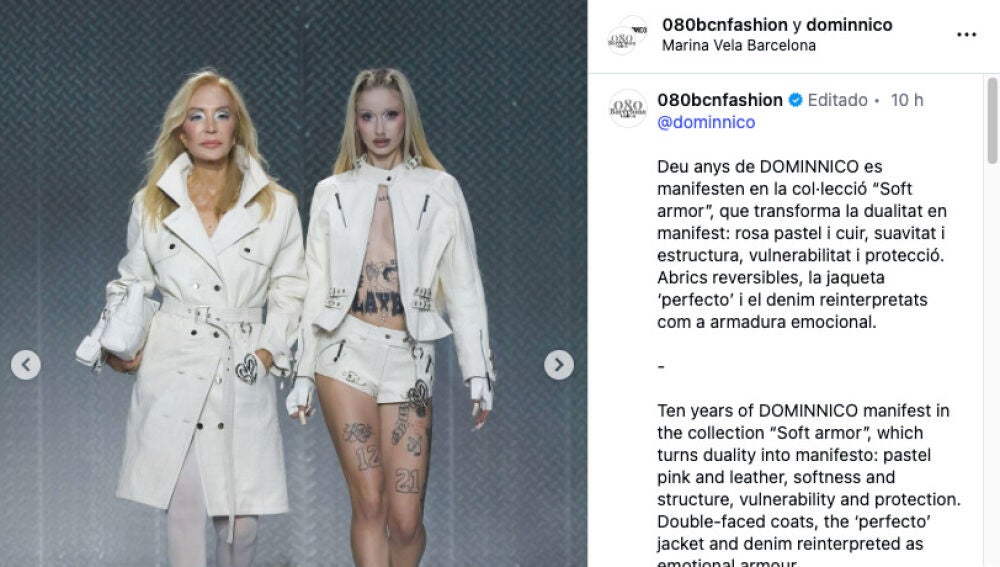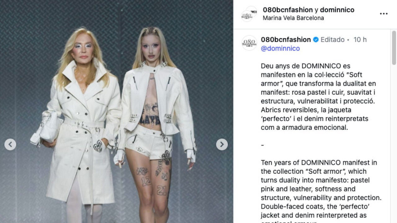Las dos han desfilado juntas, de la mano, en la última presentación de la firma durante la pasarela 080 de Barcelona. Dominnico decidió vestirlas a juego con algunos de los modelos de su última colección (en el caso del de Carmen Lomana, con un look más modesto de lo habitual para la marca), y se han convertido rápidamente en un asunto muy comentado y compartido en redes sociales.