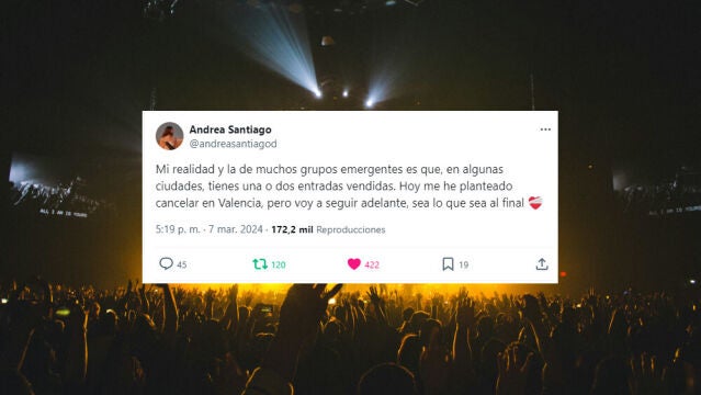 Mientras la gente se volvía loca comprando entradas para ver a Dani Martin, que va a llenar ocho veces el Wizink, con 22 meses de antelación y mientras Karol G ponía a la venta y agotaba su cuarto Santiago Bernabeu surgía en redes sociales un debate sobre la música en directo en nuestro país. Era la cantante Andrea Santiago la que se volvía viral al denunciar su realidad y la de muchos artistas emergentes que sufren por llenar salas pequeñas a precios populares.