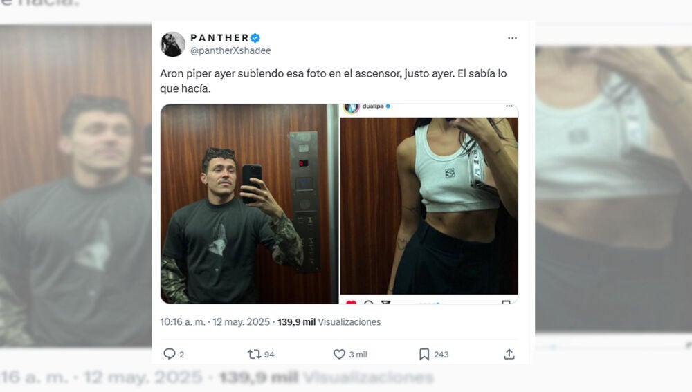 Durante las últimas horas, varios usuarios de plataformas como X o Instagram han empezado a atar cabos a raíz de unas publicaciones aparentemente inocentes. Tanto Aron Piper como Dua Lipa compartieron imágenes desde lo que parece ser el mismo ascensor, con un diseño y unos botones idénticos, lo que ha dado pie a todo tipo de especulaciones sobre si han vuelto a verse en Madrid.