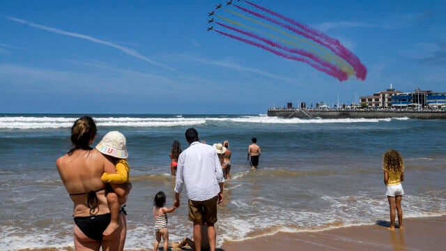Aviones que parecen OVNIs en la penumbra del cielo y un pueblo atolondrado saludando desde la playa a los pájaros de hierro con luces LED y fuegos artificiales en el culo como cuando pasaba el tren de Espinete en los créditos de Barrio Sésamo, y con música de Orishas de fondo, así ha sido la exhibición nocturna a la fresca, aunque el olor a sudor, a putrefacción y a semen de viejo no desapareció. La humanidad es la peste. Gente alzando los brazos desde la arena como pidiendo "ven y secuéstrame, por favor". Con paciencia, intentas hacer alguna foto y no se cuelan en el plano más que cabezas de calvos. En estas situaciones no me queda más que partirme de risa y disimular mirando por WhatsApp conversaciones con mi marido imaginario de misión masturbándose en su buhardilla, porque esta gente es muy violenta y en cualquier momento saca un bate de béisbol y te pega.