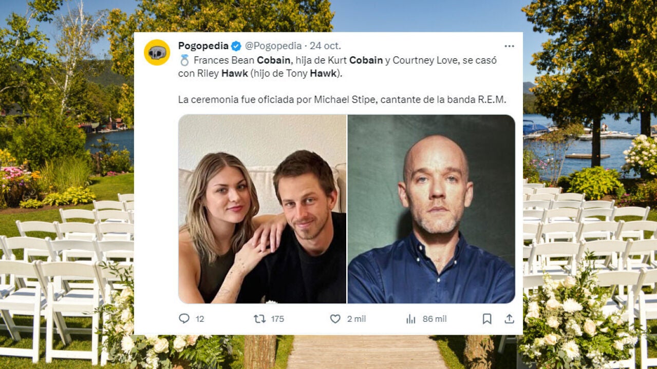 La hija de Kurt Cobain y el hijo de Tony Hawk ahora son marido y mujer tras casarse en una boda oficiada por nada menos que el cantante de REM.