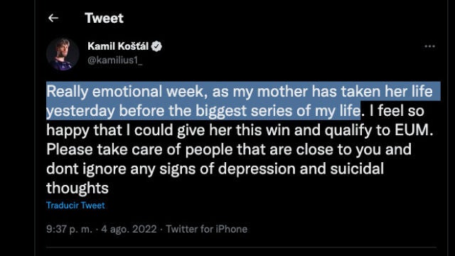 "Ha sido una semana llena de emociones, porque mi madre se quitó la vida ayer antes de la partida más importante de mi carrera", dice en un tuit que transcribimos completo porque dudamos que vaya a durar mucho tiempo colgado. "Estoy tan feliz por poder dedicarle esta victoria y haberme clasificado para el European Master. Por favor, cuidad de la gente que os rodea y no ignoréis los síntomas de depresión o los pensamientos de suicidio".