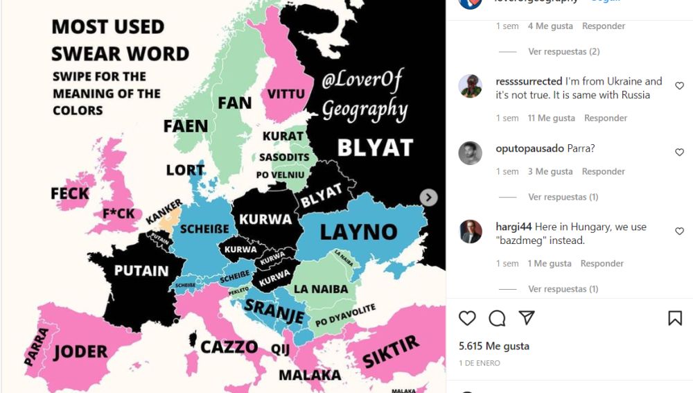 La cuenta de Instagram Love for Geography ha creado un mapa de Europa que recoge cuáles son las palabrotas más usadas en cada país, clasificándolas en cuatro grupos según su procedencia.