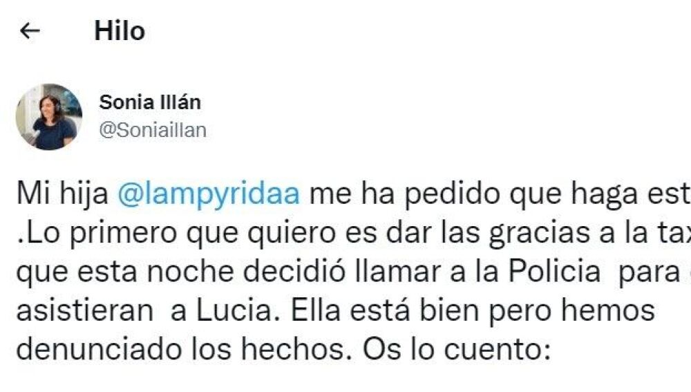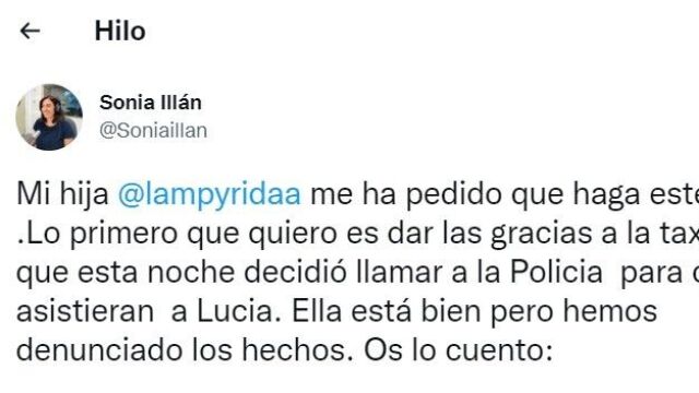 "Mi hija @lampyridaa me ha pedido que haga este hilo. Lo primero que quiero es dar las gracias a la taxista que esta noche decidió llamar a la Policía para que asistieran a Lucía. Ella está bien pero hemos denunciado los hechos. Os lo cuento:", ha escrito en un tuit que ya acumula más de 10.000 'me gusta', 3.000 retuits y 300 comentarios.