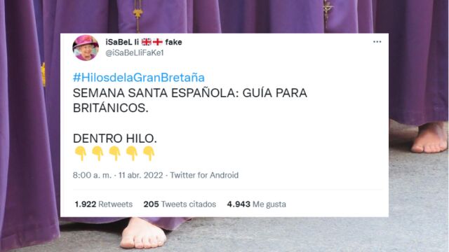 Son muchos los visitantes que vienen a España en estas fechas y un hilo de Twitter ha querido explicar, de una forma curiosa y en tono de humor, la Semana Santa española a los británicos. La cuenta @iSaBeLIiFaKe1 ha querido hacer esta particular guía de una de las fiestas principales de nuestro país para los ciudadanos británicos. Lo ha hecho a su manera, con mucho humor, lo que ha convertido que este hilo se haya convertido en un fenómeno viral. El tuit que inicia ese hilo lleva ya más de 5 mil likes.