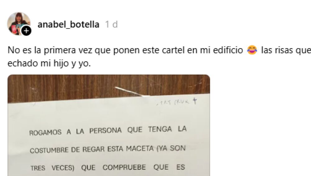 "No es la primera vez que ponen este cartel en mi edificio las risas que nos hemos echado mi hijo y yo", ha escrito @anabel_botella.