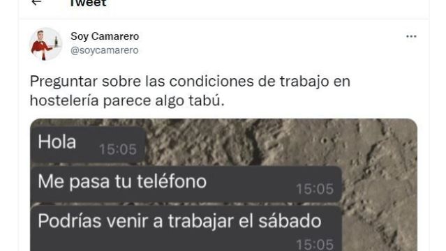 "Preguntar sobre las condiciones de trabajo en hostelería parece algo tabú", decía el tuit acompañado de un pantallazo de WhatsApp que ha acumulado casi 50.000 'me gusta'.