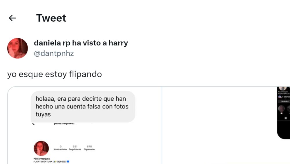 "Yo es que estoy flipando", añade Daniela en el cuerpo del tuit. Pero lo que es para flipar aún más fuerte es lo que ella ha ido descubriendo luego, una vez se puso a cotillear el perfil fraudulento.