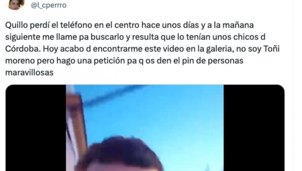 Pero lo mejor es lo que se encontró más tarde mirando sus vídeos guardados. "Hoy acabo d encontrarme este video en la galeria, no soy Toñi moreno pero hago una petición pa q os den el pin de personas maravillosas", añade.