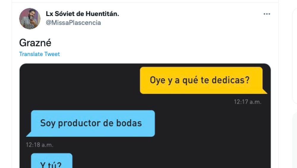 Después de lo que se intuye como una conversación común para conocerse, el otro usuario de la aplicación pregunta: "Oye, y a qué te dedicas", a lo que el tuitero responde: "Soy productor de bodas, ¿y tú?".