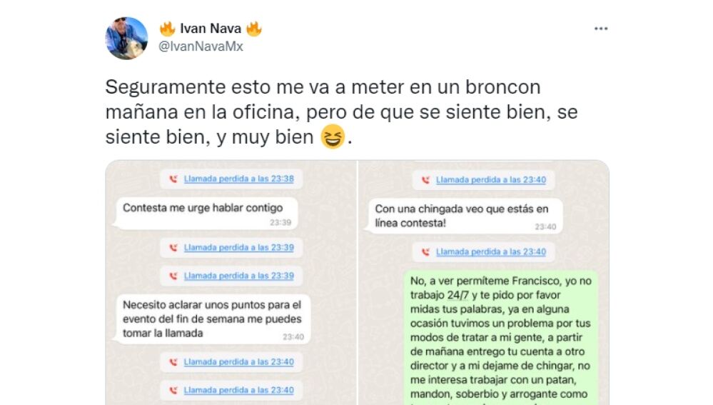 "No, a ver, permíteme, Francisco, yo no trabajo 24/7 y te pido que, por favor, midas tus palabras, ya en alguna ocasión tuvimos un problema por tus modos de tratar a mi gente, a partir de ahora entrego tu cuenta a otro director y a mi déjame de chingar. No me interesa trabajar con un patán, mandón, soberbio y arrogante como tú. Que tengas buenas noches", sentenció Iván antes de bloquear a Francisco.