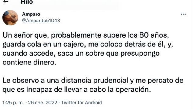 "Un señor que, probablemente supere los 80 años, guarda cola en un cajero, me coloco detrás de él, y, cuando accede, saca un sobre que presupongo contiene dinero. Le observo a una distancia prudencial y me percato de que es incapaz de llevar a cabo la operación", escribía en el primer tuit de este hilo que ha conseguido 40.000 'me gusta' y 16.000 'retuits'.