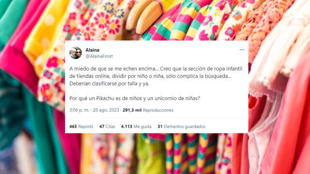 "A miedo de que se me echen encima... Creo que la sección de ropa infantil de tiendas online, dividir por niño o niña, sólo complica la búsqueda... Deberían clasificarse por talla y ya. ¿Por qué un Pikachu es de niños y un unicornio de niñas?", escribe Alaina en un tuit que ha sido reproducido ya 300.000 veces y ha acumulado más de 4.000 'me gusta' y 200 comentarios.