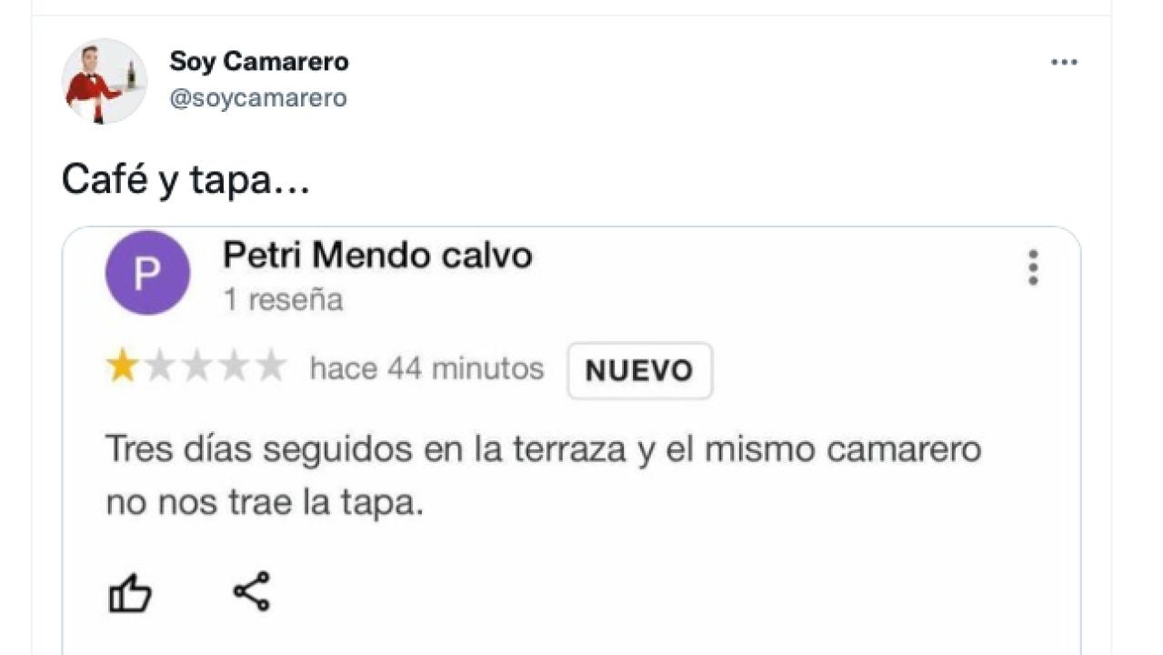 El cliente no siempre tiene la razón, y la cuenta de Twitter @soycamarero lo demuestra constantemente. La célebre cuenta que muestra el lado oscuro de la hostelería a través de sus publicaciones, ha compartido recientemente la reseña de un cliente resentido porque no le pusieron tapa durante sus consumiciones. En la reseña, acompaña de de una estrella sobre 5, el consumidor escribió: "Tres días seguidos en la terraza y el mismo camarero no nos trae la tapa".