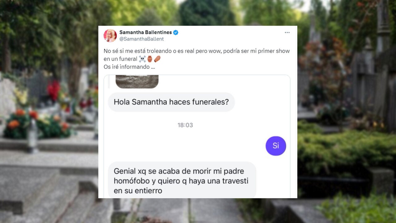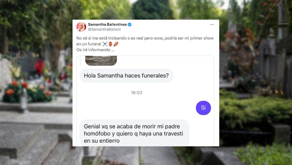 "Hola Samantha, ¿haces funerales?", comenzaba el mensaje que desató la historia. Ante la afirmativa respuesta de la artista, el seguidor le explicó el motivo de su curiosa solicitud: "Genial, porque se acaba de morir mi padre homófobo y quiero que haya una travesti en su entierro". Ante esta surrealista petición, Samantha solo pudo responder con un expresivo "ostias".