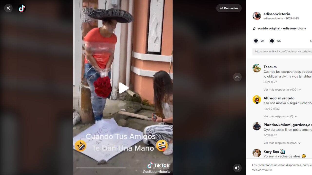 Desde hace varias semanas, un video ha causado gran sensación dentro de TikTok, debido a que un grupo de amigos decidió ayudar a su amigo, con la chica que le gusta desde hace más de un año, de la manera más surrealista posible. Y es que el grupo de jóvenes ataron a un poste a su amigo para que le declarara su amor a una joven. En la descripción del vídeo se lee "La mejor manera de ayudar a tu compa en el amor", y posteriormente aparece un grupo de jóvenes amarrando con cinta a uno de sus amigos.