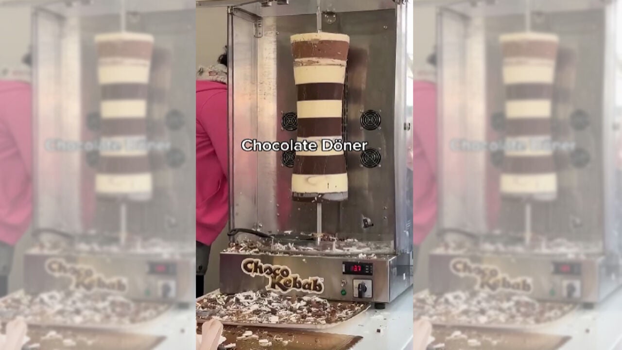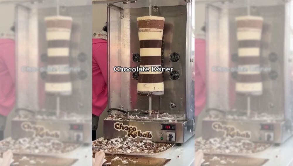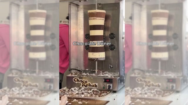Parece un kebab, pero no lo es. En lugar de carne asada, lo que gira sobre el trompo es una gigantesca barra de chocolate helado que se va cortando en finas láminas con la misma técnica que se emplea en los locales de comida turca. Las virutas de chocolate se colocan sobre una base que recuerda al pan de pita, se enrollan como un durum y se sirven al cliente como si fuera una cena salada. Pero es, en realidad, un postre.