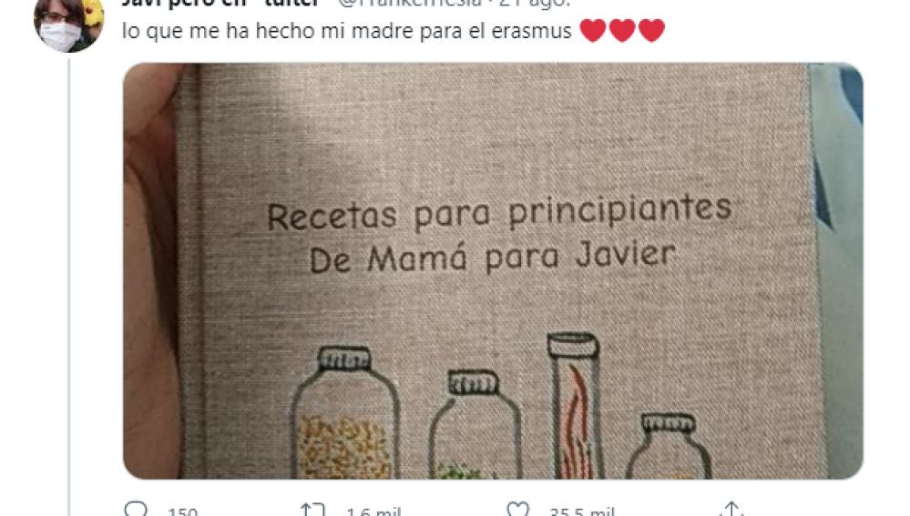 Javier decidió compartir el regalo en su cuenta de Twitter @frankentesla donde el libro: "Recetas para principiantes de Mamá para Javier'' se ha vuelto viral superando los 35.000 'me gusta'.
