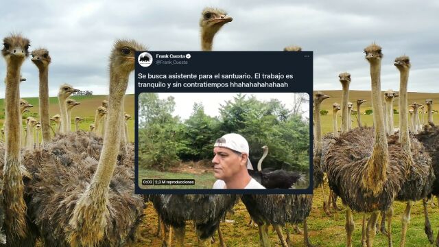 Frank Cuesta ha vuelto a ser viral en Twitter gracias a un vídeo que subió el primer día de agosto en el que era arrollado por un avestruz mientras caminaba por su nuevo santuario. De forma irónica, el propio Frank puso como texto en la publicación un anuncio de empleo para ayudarle en su refugio: "Se busca asistente para el santuario. El trabajo es tranquilo y sin contratiempos".