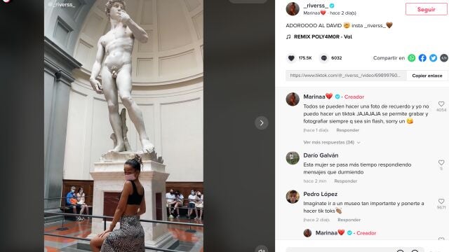 Pero la "generación Tik Tok" parece que levanta más ampollas de la cuenta. Jóvenes a los que el selfie se les queda corto y graban vídeos bailando en cualquier momento y lugar para compartirlos en la red social en auge. Ahora, una nueva moda creciente entre los tiktokers ha generado debate en redes: bailar o grabar vídeos en museos y delante de obras históricas. En concreto, recientemente este vídeo de una influencer bailando ante el David de Miguel Ángel se ha hecho viral y su actitud ha levantado ampollas. En el vídeo, la tiktoker Marina Rivers aparece bailando reggaeton durante unos segundos con la escultura detrás y, cuando acaba, la cámara enfoca al miembro de mármol.