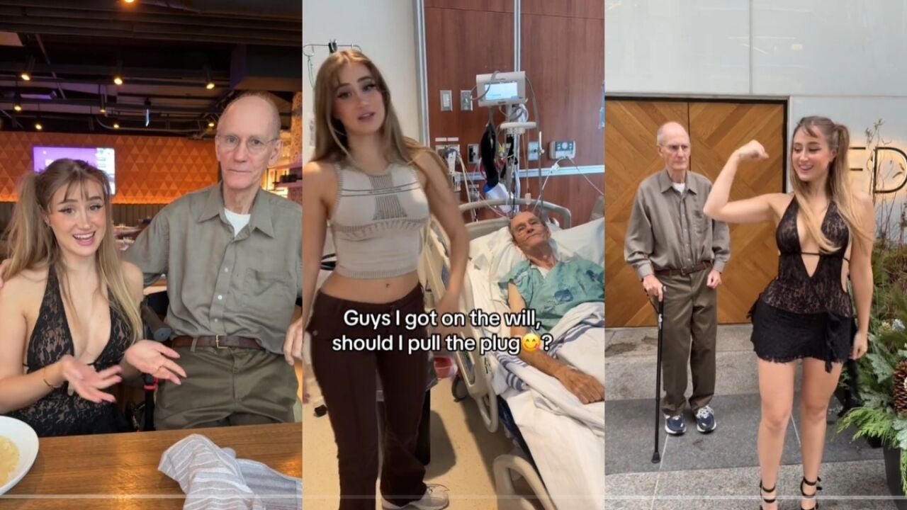 Una modelo y tiktoker es duramente criticada por bailar alegremente junto a la cama de hospital de su novio anciano mientras se prepara para heredar su fortuna.
