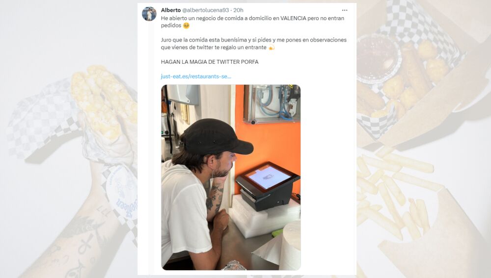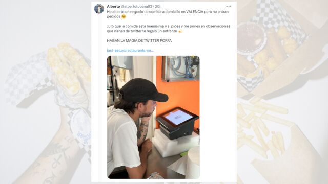 Tal y como ha explicado Alberto, no hace mucho que decidió abrir un negocio de comida a domicilio y, pese a que se nota que empezó este proyecto con mucha ilusión, en estos momentos parecía estar perdiendo la ilusión porque no le entraba ningún pedido. Por ello, con mucha esperanza, le ha pedido a Twitter que haga su magia, y ha ofrecido a todos sus posibles clientes la opción de recibir un entrante gratis si le avisaban que venían desde esta publicación. Y, sin duda, ha conseguido atraer los poderes que tiene esta red social, ya que su tuit ha terminado consiguiendo más de 36.000 me gustas y más de 24.000 retuits.