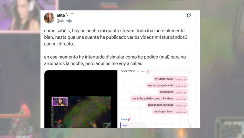 La streamer Alemjx publicó un mensaje en su perfil de X relatando el acoso que sufrió durante su quinto directo en Twitch. Según explicó, mientras realizaba la transmisión, una cuenta difundió varios vídeos de carácter sexual en los que una persona se masturbaba utilizando su emisión en vivo. "Como sabéis, hoy he hecho mi quinto stream. Todo iba increíblemente bien, hasta que una cuenta ha publicado varios vídeos masturbándose con mi directo", escribió.