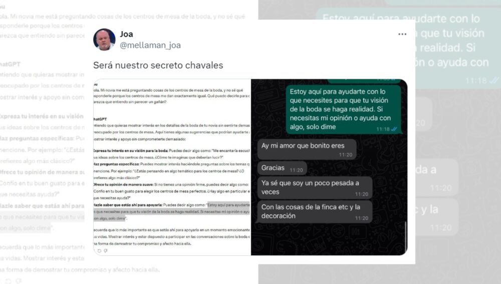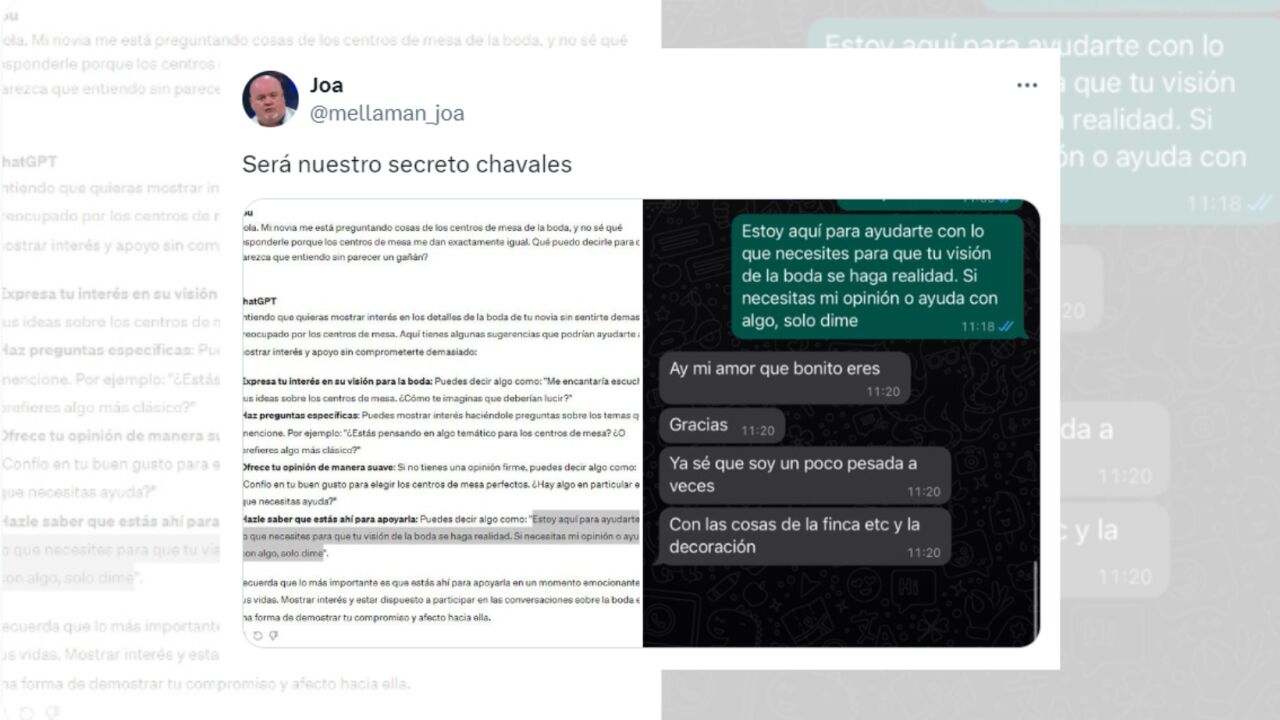 Y esto es precisamente lo que ha hecho el tuitero Mellaman_joa, a quien las redes han criticado muy duramente por utilizar una respuesta que le ha dado el ChatGPT para responder a una pregunta que le ha hecho su pareja sobre la boda. Porque, pese a que ella quería saber su opinión sobre los centros de mesa que utilizarán, él le confiesa a esta inteligencia artificial que le dan "exactamente igual", por lo que no sabía qué responderle sin parecer un "gañán". Pero, si esto ya les hizo poca gracia a muchos tuiteros, el hecho de que ella se disculpe con él por ser "pesada" y le agradezca esas palabras, ha sentado todavía peor a los usuarios.