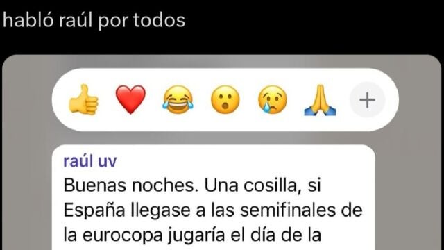 En el mensaje, un compañero llamado Raúl expresa una preocupación que muchos comparten y es que el partido de semifinales de España en la Eurocopa coincide con el día de la graduación. "Buenas noches. Una cosilla, si España llegase a las semifinales de la Eurocopa jugaría el día de la graduación a las 21.00. Los que habéis gestionado lo de la gradu, ¿podríais preguntar si ellos podrían llegar a ponernos un proyector o algo para verlo?", escribió Raúl.